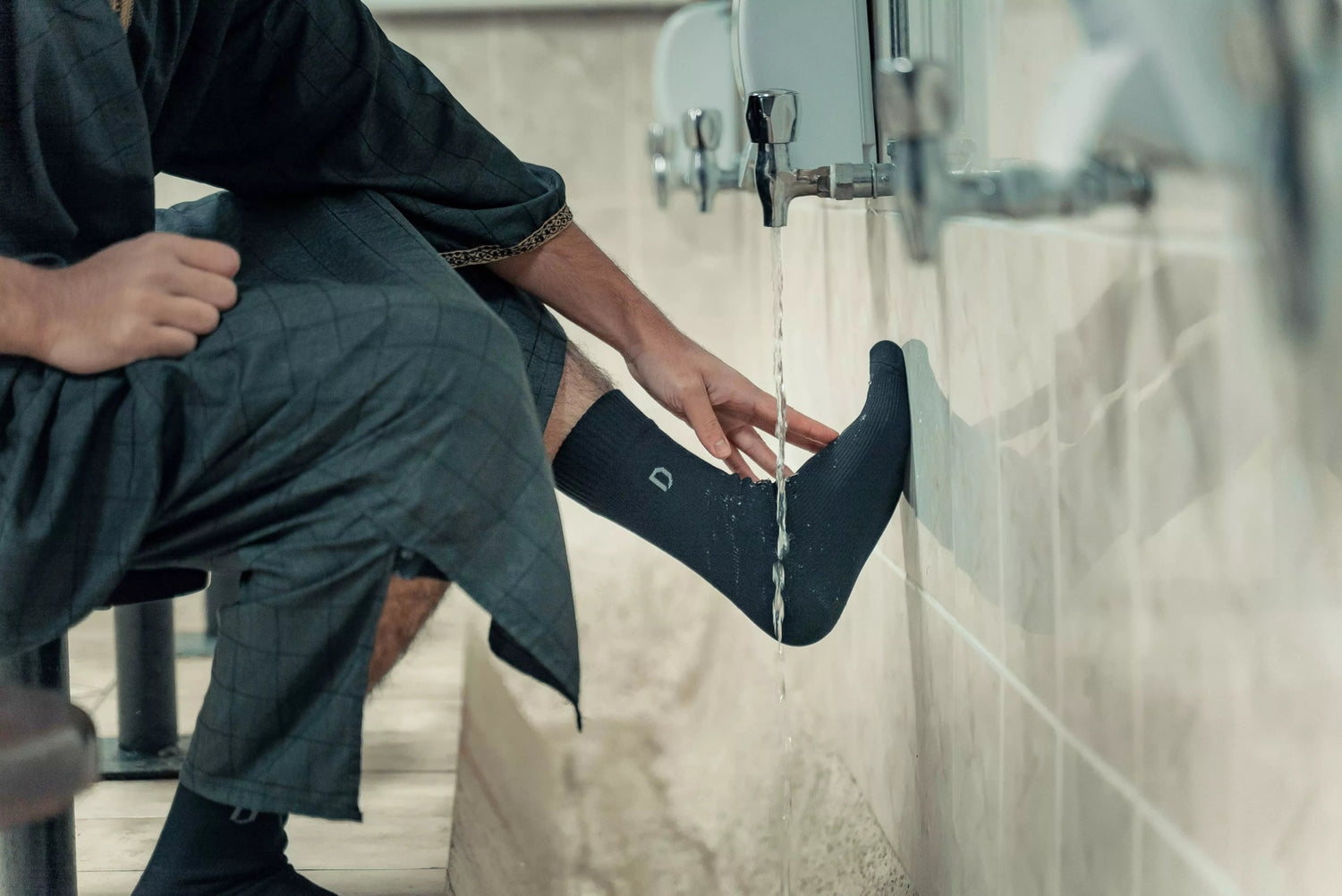 We find ourselves rushing for prayer often in the winter months when one salaah is quickly followed by another. For your average 9 to 5 office worker, it gets really difficult to go and do Wudu in the sink in a rush, leaving an unwanted mess of water all over the floor and around the sink.. DAKY socks solves the above issue for Muslims in the modern world.